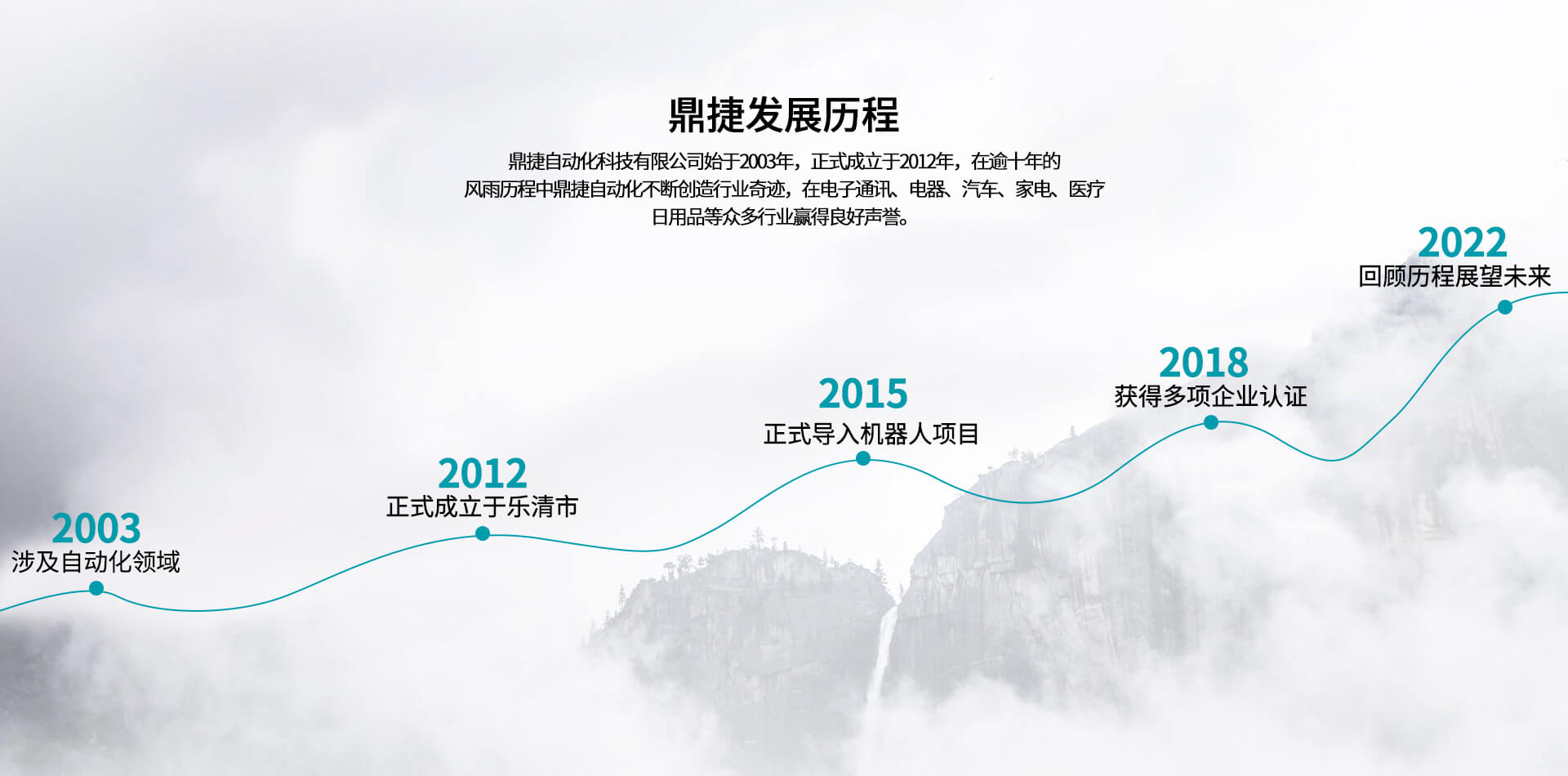 公司始于2012年,在逾十年的風(fēng)雨歷程中,不斷創(chuàng)造行業(yè)奇跡,在電子通訊、電器、汽車(chē)、家電、醫(yī)療、日用品等眾多行業(yè)贏(yíng)得良好聲譽(yù)。公司坐落于浙江省樂(lè)清經(jīng)濟(jì)開(kāi)發(fā)區(qū),現(xiàn)有人員63人,擁有經(jīng)驗(yàn)豐富的工程技術(shù)研發(fā)團(tuán)隊(duì)11人,其中高級(jí)工程6人,具備本科以上學(xué)歷高級(jí)工程人員比例78%;同時(shí)鼎捷自動(dòng)化在蘇州,東莞等地設(shè)立分公司以服務(wù)目標(biāo)市場(chǎng)客戶(hù),目前鼎捷自動(dòng)化已經(jīng)為下客戶(hù)提供配套自動(dòng)化解決方案:泰科、安費(fèi)諾、莫士、華為、中興、普聯(lián)、智英、意華、德豐、公牛、萬(wàn)事達(dá)、華豐、飛雕、普思、冠聯(lián)、俊朗松田、進(jìn)聯(lián)、高正、盛凌等。鼎捷自動(dòng)化專(zhuān)業(yè)從事連接器、開(kāi)關(guān)及相關(guān)電子、電器、五金、塑膠產(chǎn)品組裝自動(dòng)化定制、設(shè)計(jì)、制造、銷(xiāo)售。2012年,鼎捷自動(dòng)化正式導(dǎo)入機(jī)器人應(yīng)用項(xiàng)目,可為各類(lèi)客戶(hù)提供電子、電器、汽車(chē)、五金、塑膠等集成自動(dòng)化智能組裝系統(tǒng)。